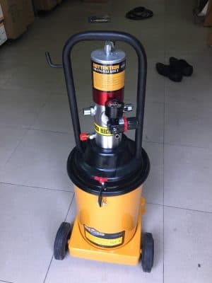 -Dùng Khí nén của máy nén khí để tạo áp suất đẩy, ưu điểm của máy là tiện dụng nhỏ gọn, có chân đẩy, dễ mang đi, thích hợp bơm ô tô, xe máy, máy móc động cơ cần bôi trơn, phân xưởng, nhà xưởng dây chuyền, bơm rất nhanh