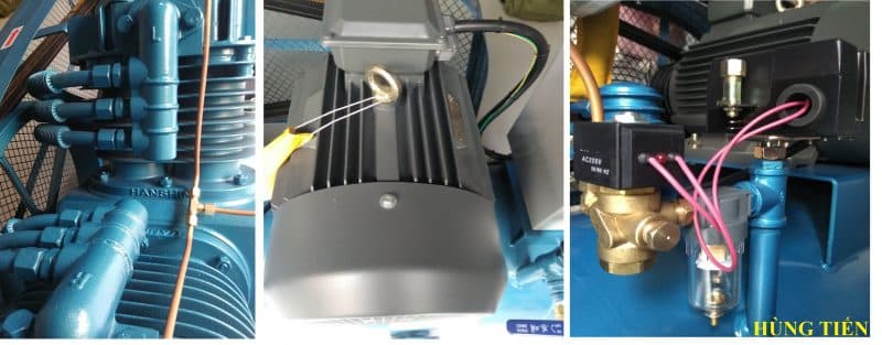 Cấu tạo máy nén khí Hanshin H-3 bao gồm : Đầu máy, Motor, Bình chứa, Hộp điện, Đồng hồ đo áp, Van xả nước.